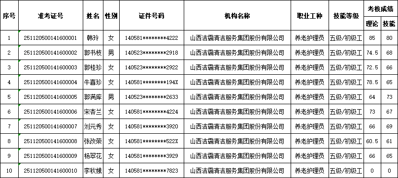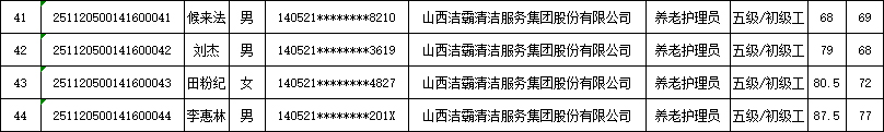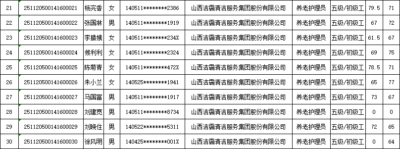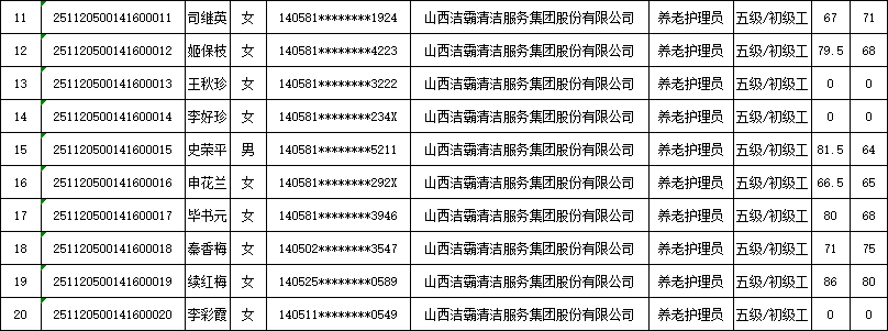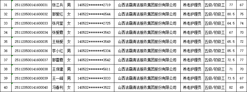山西潔霸清潔服務集團股份有限公司職業(yè)技能等級認定中心現將2025年11月22日認定人員成績公示如下: